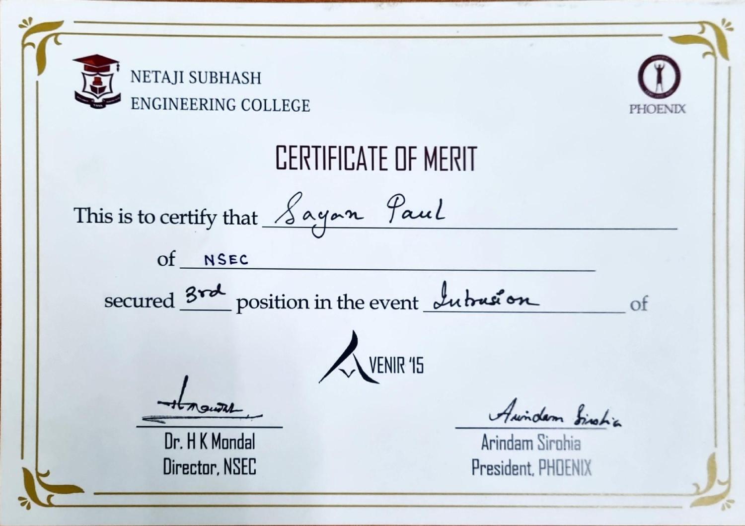 I ranked 3rd in Intrusion, an autonomous robotics competition held during Avenir 2015, the annual technical fest of Netaji Subhash Engineering College in India.