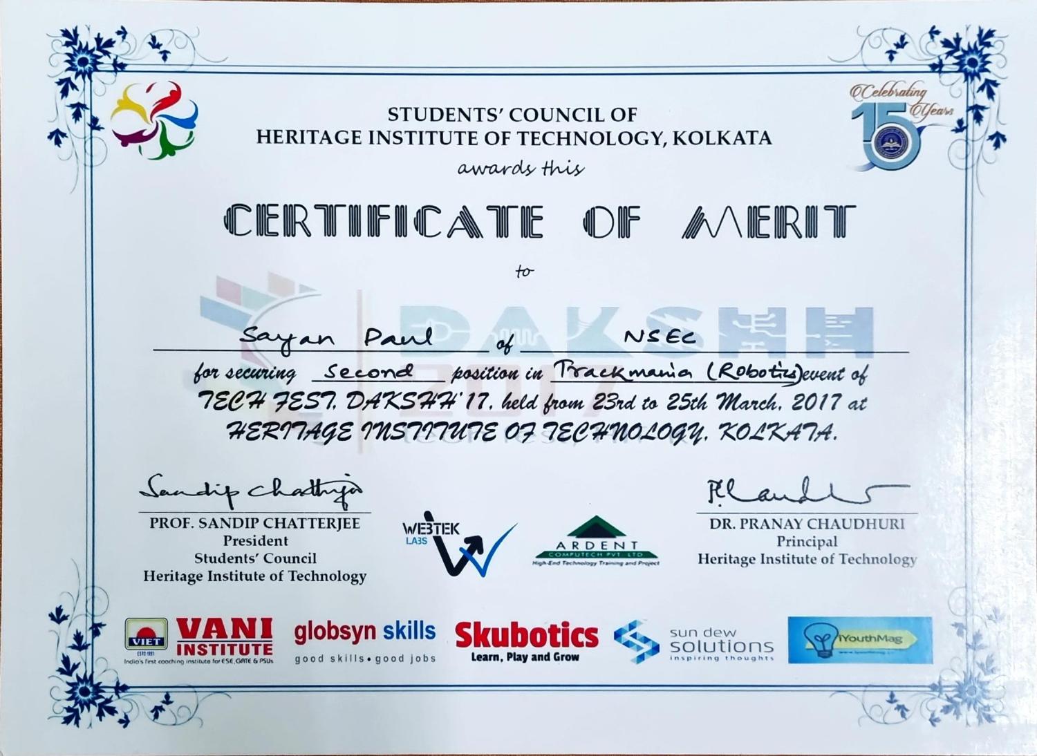 I ranked 2nd in Trackmania, an autonomous robotics competition held during Dakshh 2017, the annual technical fest of Heritage Institute of Technology in Kolkata, India.