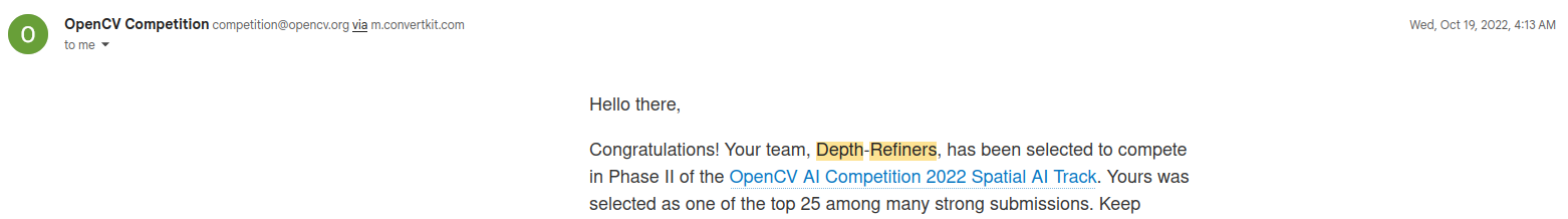 I was a finalist (Top-25 teams) in the OpenCV AI Competition 2022 — Spatial-AI Track, organized by the OpenCV Foundation, which benchmarked neural depth estimation on the OAK-D-Pro camera platform. The track challenged teams to design a high-quality, deployable depth pipeline that improves stereo depth by combining classical stereo vision with learned (neural) approaches while running within the constraints of an on-device Myriad X accelerator using the DepthAI software stack.